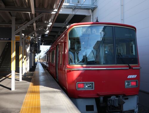 しんあんじょうは1ばんのりばで、にしおいきふつうのあっかいでんしゃがでまち。 〔なごや 16:03 → (なごやほんせん=とよはしいきとっきゅう *1) → 16:28 しんあんじょう〕 〔しんあんじょう 16:37 → (にしおせん=にしおいきふつう *2) → 16:45 ふるい…